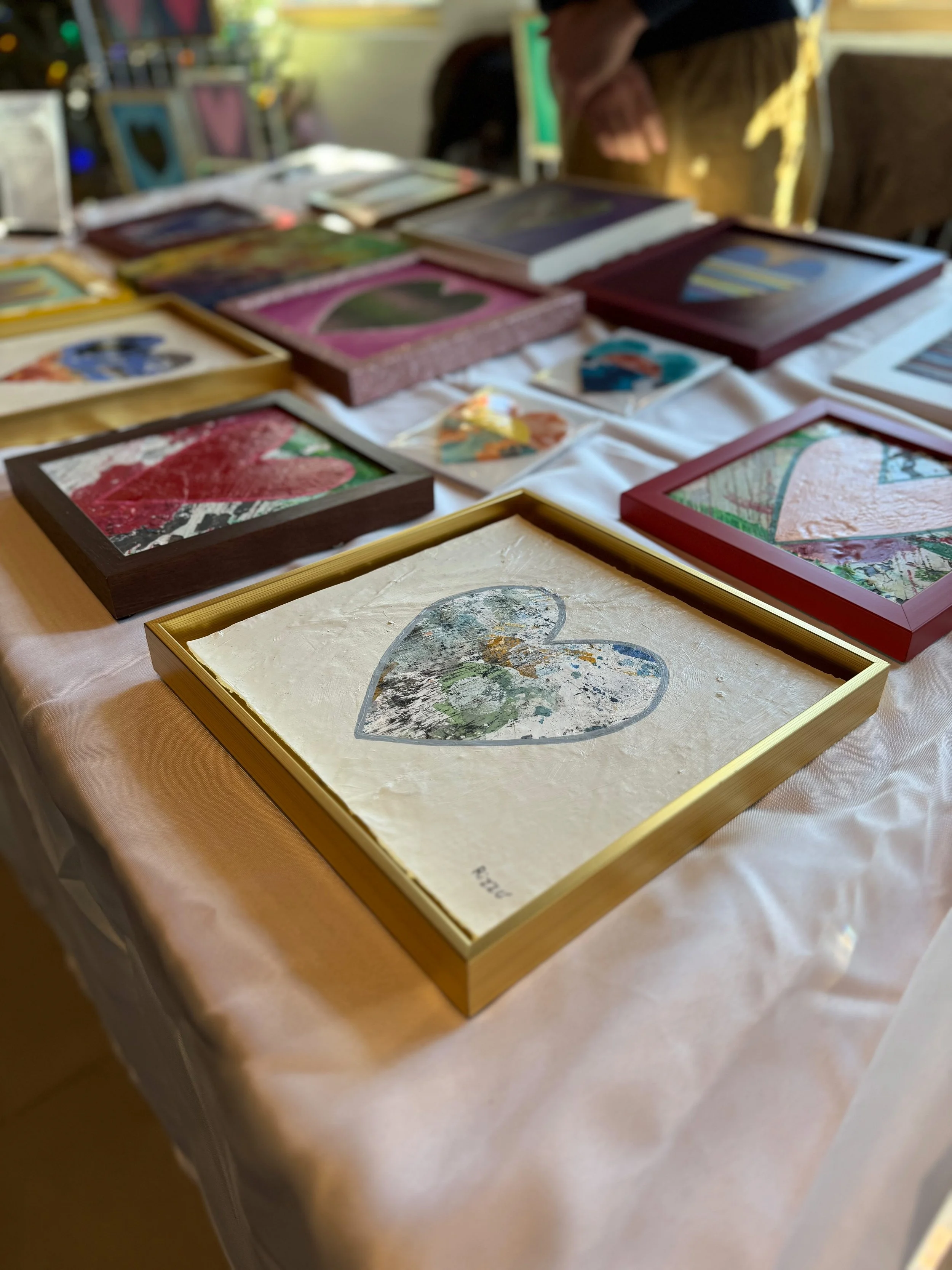 Ben Rizzo is a dynamic abstract artist known for his vibrant, emotive paintings that blend bold colors and textures. His style captures both energetic celebration and quiet introspection. At the sale, expect to see his Heart series which encompasses lucite beach hearts as well as paintings repurposed with hearts painted over them.